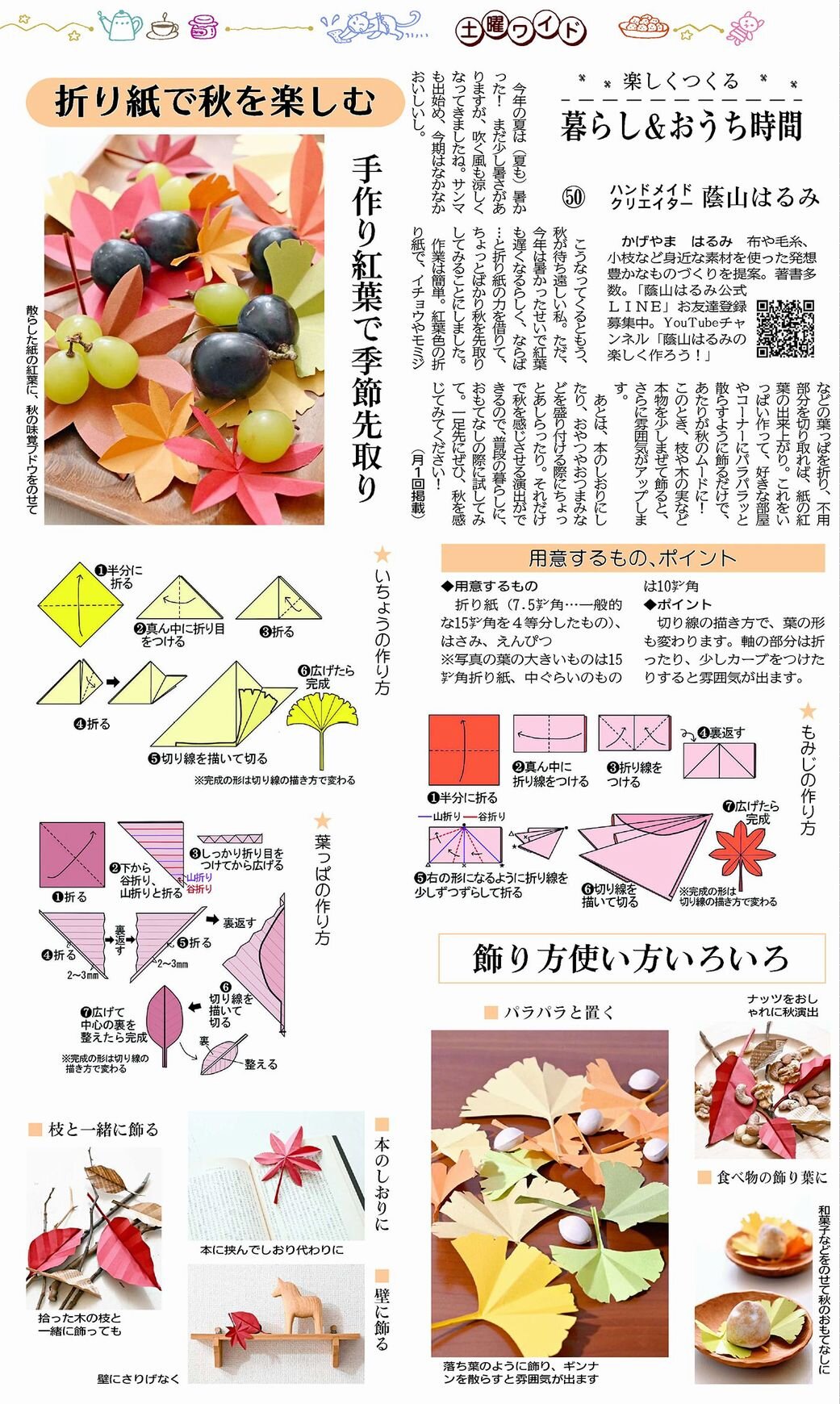 ★ハンドメイドクリエーター・蔭山はるみさんの「楽しくつくる 暮らし&おうち時間」(月1回掲載)。50回目は「折り紙で秋を楽しむ 手作り紅葉で季節先取り」。(紙面を見る、9月27日付)