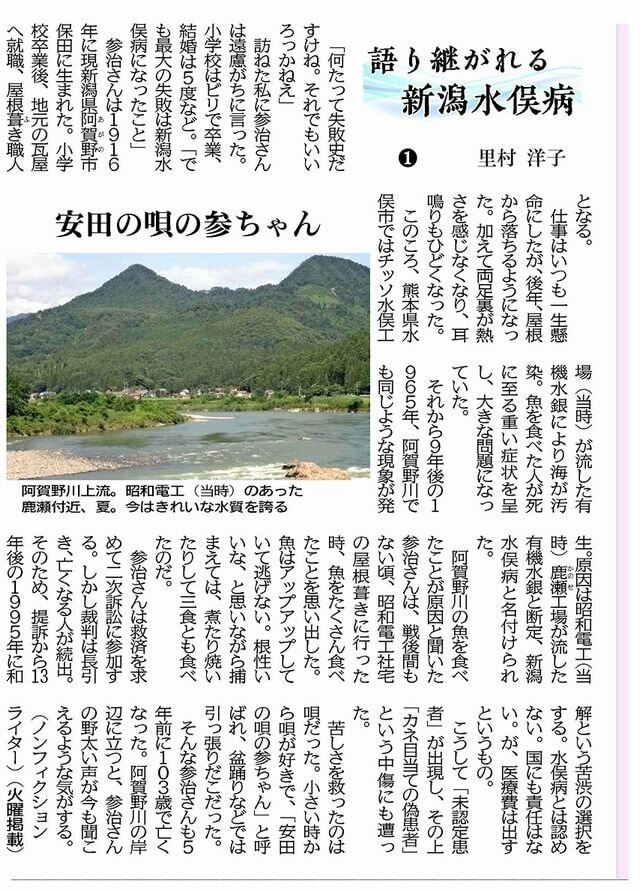 ★火曜エッセーは、ノンフィクションライター・里村洋子さんの「語り継がれる新潟水俣病」。1回目は「安田の唄の参ちゃん」(紙面を見る、10月7日付)