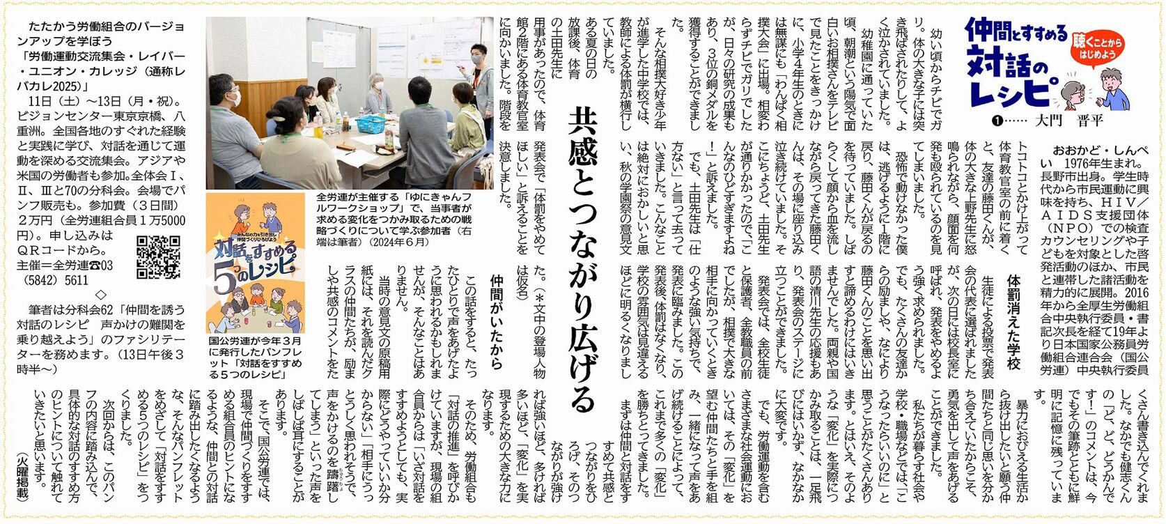 ★火曜大型連載は、国公労連中央執行委員・大門晋平さんの「仲間とすすめる対話のレシピ」。1回目は「共感とつながり広げる」(紙面を見る、10月7日付)