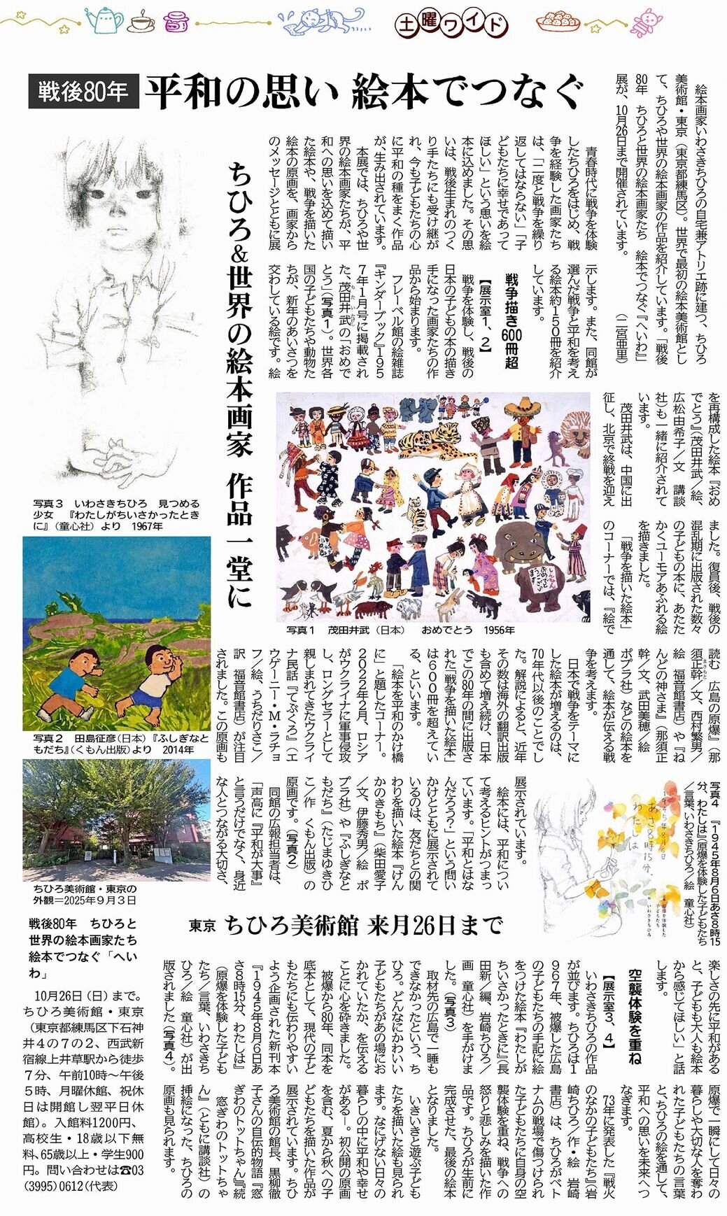 ★ちひろ美術館・東京は、世界で最初の絵本美術館として、ちひろや世界の絵本画家の作品を紹介しています。「戦後80年 ちひろと世界の絵本画家たち 絵本でつなぐ『へいわ』」展が、開催されています。(紙面を見る、9月13日付)