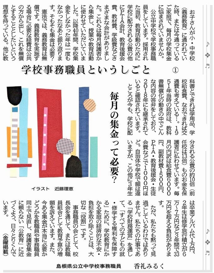 ★金曜掲載の教育エッセー、10月は島根県公立中学校事務職員・香礼みるくさんの「学校事務職員というしごと」。1回目は「毎月の集金って必要?」。(紙面を見る、10月3日付)