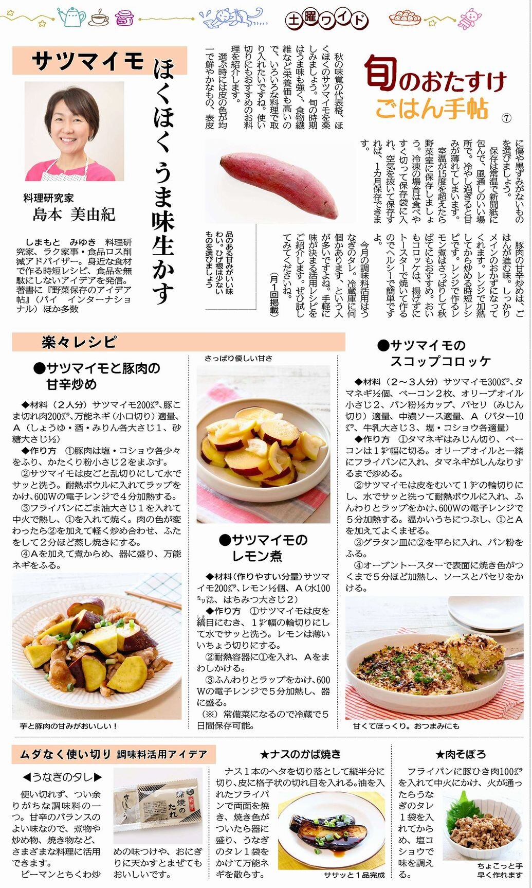 島本美由紀さんの「旬のおたすけごはん手帖」(第1土曜掲載)。7回目は「サツマイモ ほくほく うま味生かす」(紙面を見る、10月4日付)