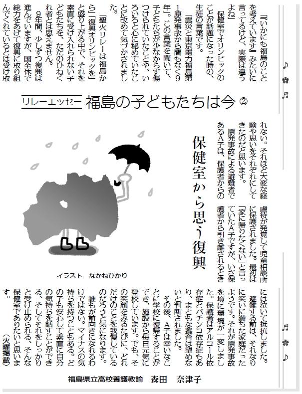 ★火曜掲載の教育エッセー、3月は「リレーエッセー 福島の子どもたちは今」。2回目は「保健室から思う復興」(紙面を見る、3月10日付)