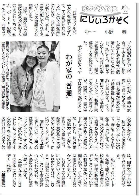 ★金曜エッセーは「ゆるやかににじいろかぞく」。子育てするLGBTの団体「にじいろかぞく」代表の小野春さんがつづります。1回目は「わが家の〝普通〟」。(紙面を見る、3月6日付)