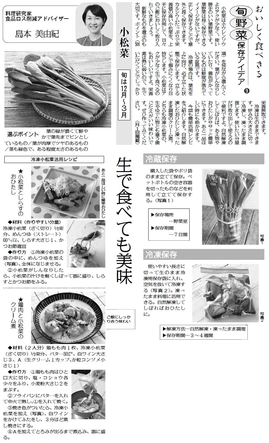 <おいしく食べきる 旬野菜アイデア」 3月は「生で食べても美味 小松菜」>(紙面を見る、3月4日付)