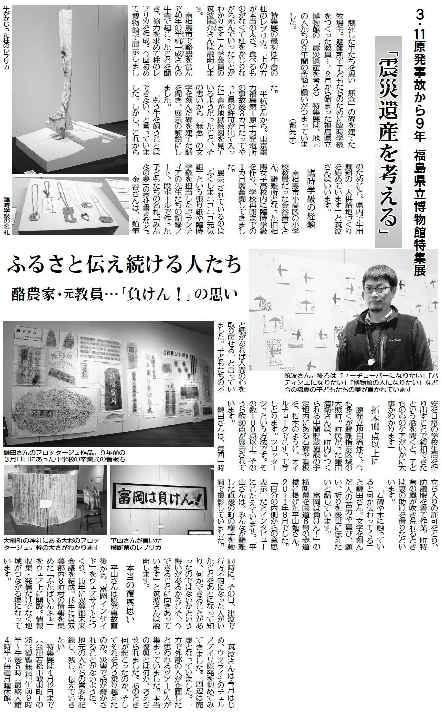 ★餓死した牛たちを思い「無念」の碑を建てた牧場主。避難所で子どもたちのために臨時学級をつくった教員…。2月から始まった福島県立博物館の「震災遺産を考える」特集展は、地元の人たちの9年間の苦悩と願いがつまっていました。(紙面を見る、3月11日付)