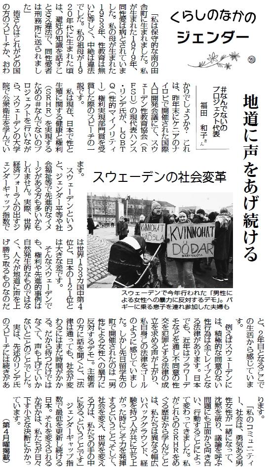 ★「くらしのなかのジェンダー」(第4月曜掲載)。20回目は、#なんでないのプロジェクト代表の福田和子さん。「スウェーデンの社会変革 地道に声をあげ続ける」です。(紙面を見る、2月24日付)