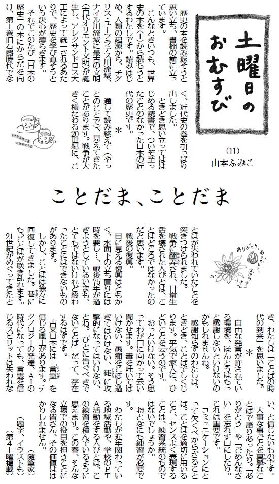 ★随筆家の山本ふみ子さんの「土曜日のおむすび」(第4土曜掲載)。11回目は「ことだま、ことだま」。(紙面を見る、2月22日付)