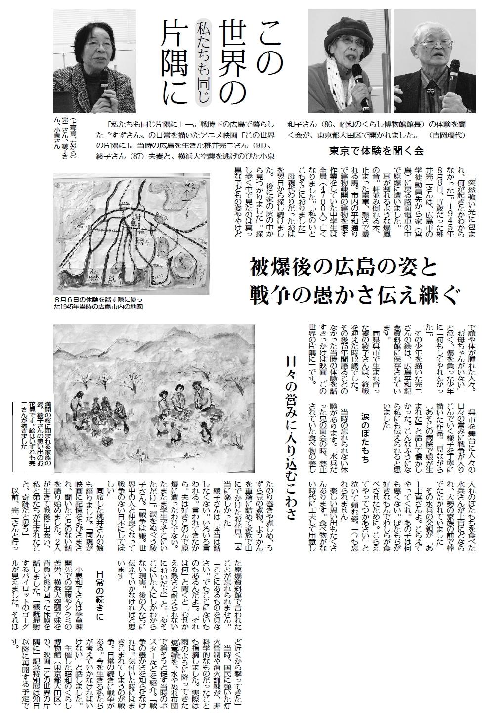 ★「私たちも同じ片隅に」―。戦時下の広島で暮らした〝すずさん〟の日常を描いたアニメ映画「この世界の片隅に」。当時の広島を生きた桃井完二さん(91)、綾子さん(87)夫妻と、横浜大空襲を生き延びた小泉和子さん(86、昭和のくらし博物館館長)の体験を聞く会が開かれました。(紙面を見る、3月10日付)