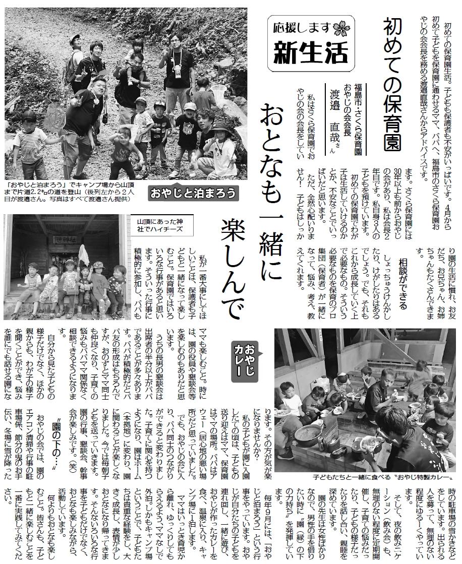 ★初めての保育園生活。子どもも保護者も不安がいっぱいです。4月から始めて子どもを保育園に通わせるママ、パパへ。福島市のさくら保育園おやじの会会長を務める渡邉直哉さんからのアドバイスです。(紙面を見る、2月24日付)