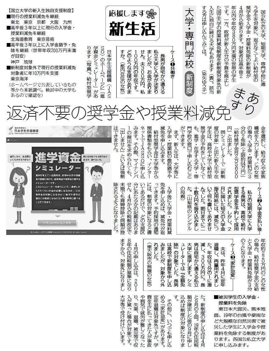 ★大学や短大、専門学校に通う学生を対象に、返さなくていい給付型の奨学金や入学金・授業料免除の新制度が4月から始まります。対象者は高卒2年以内や年収380万円未満の世帯の学生です。一方、政府が新入生分の予算を廃止した国立大学の授業料減免制度を新制度対象外の新入生に独自に続ける大学もあります。(紙面を見る、3月3日付)