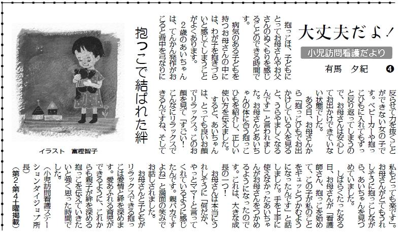 ★小児訪問看護ステーション ダイジョブ所長の有馬夕紀さんの連載コラムが始まりました。「大丈夫だよ! 小児訪問看護だより」です。4回目は「お父さんの想い」。(紙面を見る、2月22日付)
