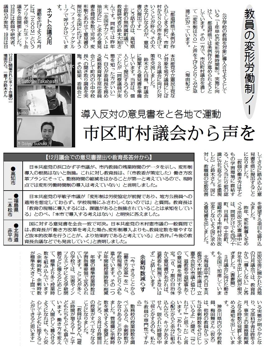 ★公立学校の教職員を対象に導入させようとしている「1年単位の変形労働時間制」。実施に向けて、都道府県では条例づくりが進められようとしています。その一方で、市区町村議会を通して「変形制はNO」と声を上げるとりくみが急速に広がっています。(紙面を見る、2月25日付)