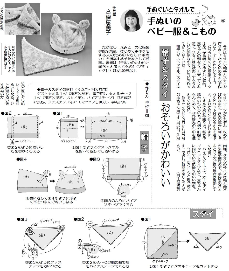 ★手芸家の高橋恵美子さんが紹介する「手ぬぐいとタオルで 手ぬいのベビー服&こもの」(月1回掲載)。5回目は「帽子&スタイ おそろいがかわいい」です。(紙面を見る、12月27日付)