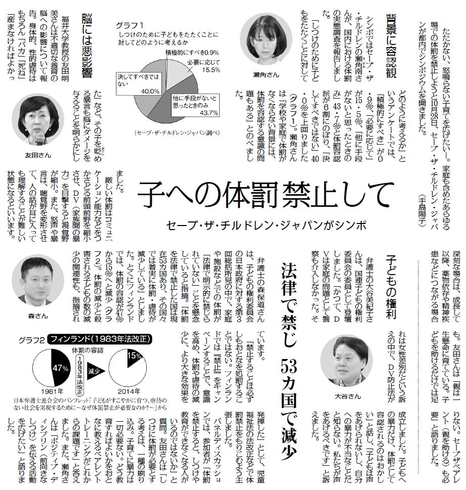 ★たたかない、怒鳴らない子育てを広げたい―。家庭も含めたあらゆる場での体罰を禁止しようと、セーブ・ザ・チルドレン・ジャパンがシンポジウムを開きました。(紙面を見る、11月4日付)