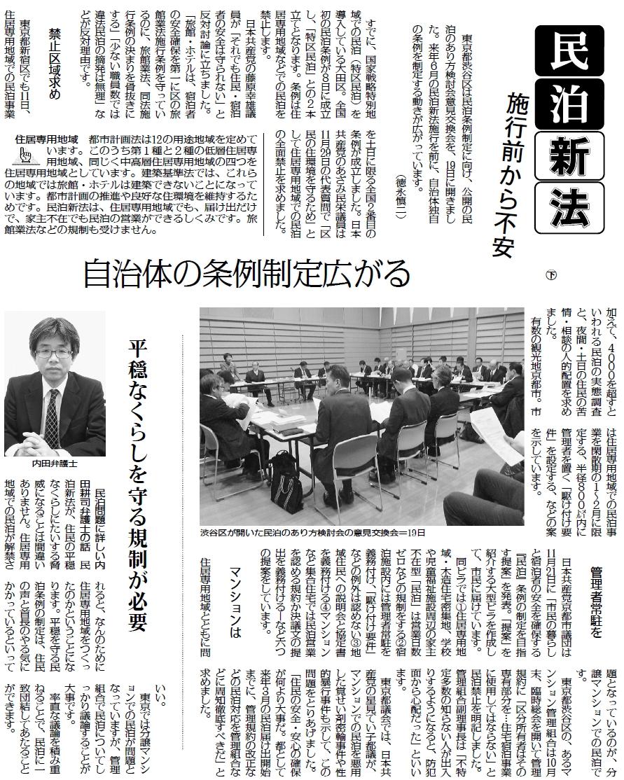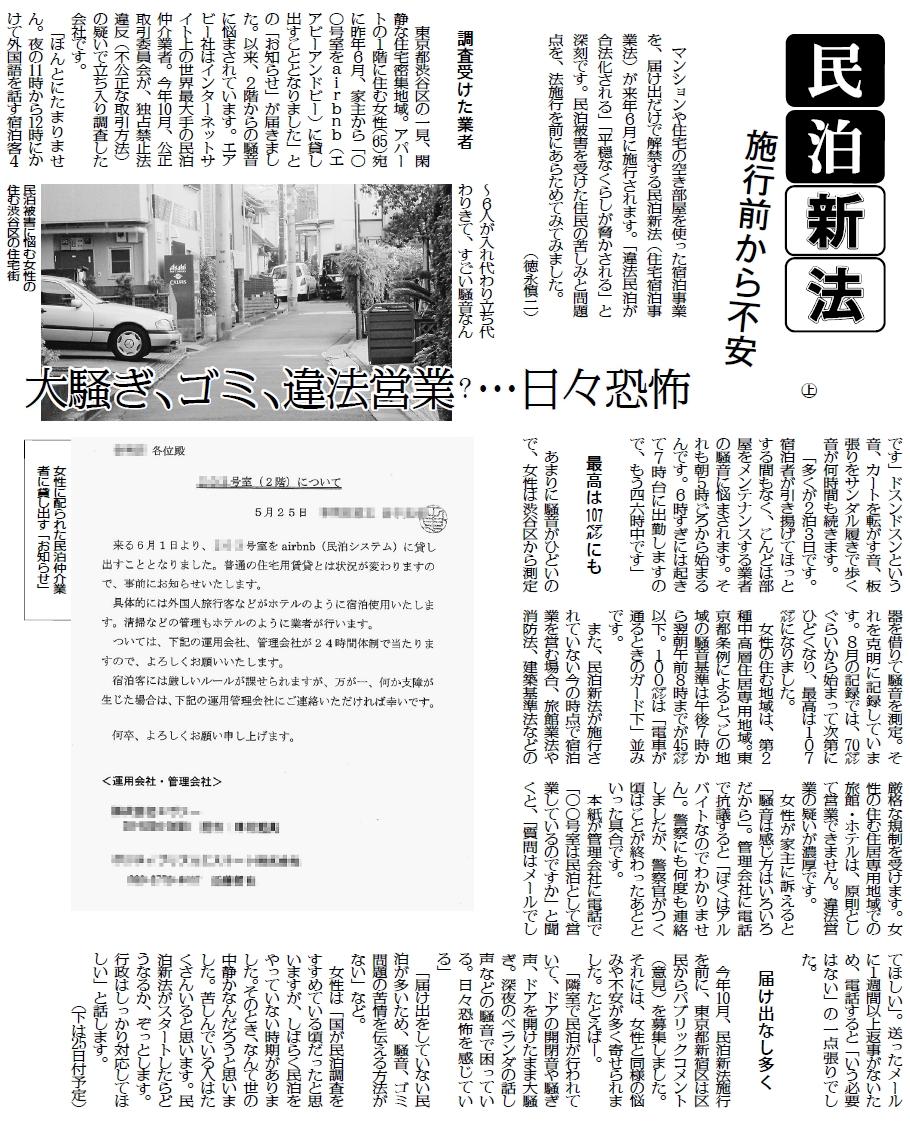 ★マンションや住宅の空き部屋を使った宿泊事業を、届け出だけで解禁する民泊新法が6月に施行されます。「違法民泊が合法化される」「平穏なくらしが脅かされる」と深刻です。民泊被害を受けた住民の苦しみと問題点を、法施行を前に改めて見てみました。(紙面を見る、12月20日付、25日付)