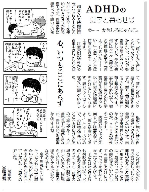 ★金曜エッセーは、漫画家・かなしろにゃんこ。さんの「ADHDの息子と暮らせば」。2回目は「心、いつもここにあらず」です。(紙面を見る、1月12日付)