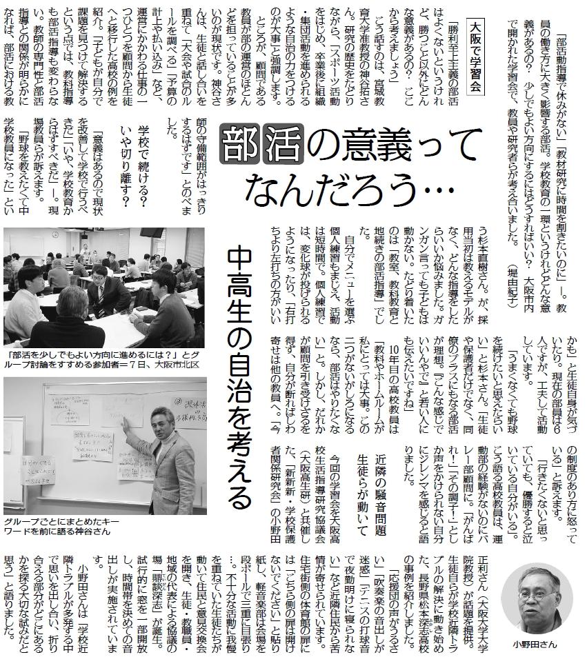 ★「部活動指導で休みがない」「教材研究に時間を割きたいのに」―。教員の働き方に大きく影響する部活。学校教育の一環というけれどどんな意義があるの? 少しでもよい方向にするにはどうすればいい? 教員や研究者らが考え合いました。(紙面を見る、1月13日付)