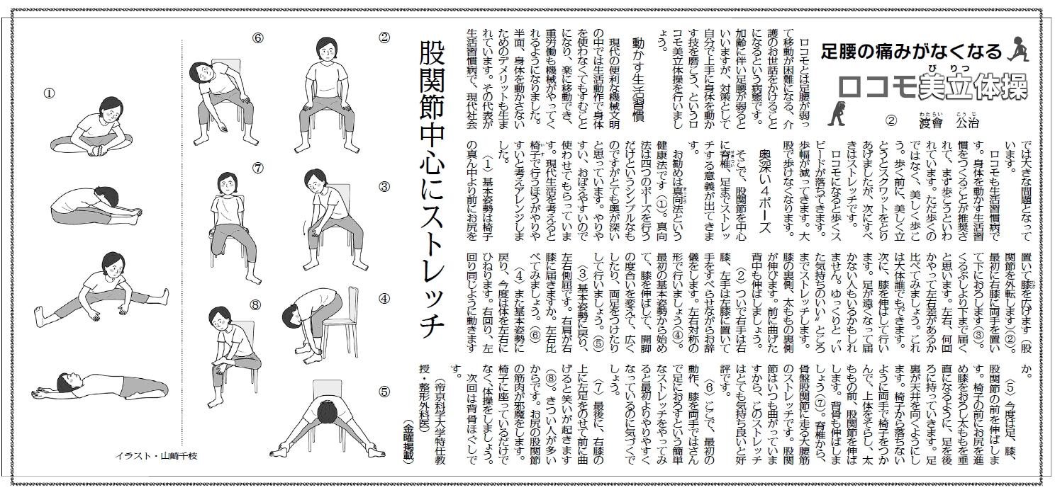 ★金曜大型連載は、帝京大学特任教授・整形外科医の渡會公治さんの「足腰の痛みがなくなる ロコモ美立体操」。2回目は「股関節中心にストレッチ」。(紙面を見る、1月12日付)