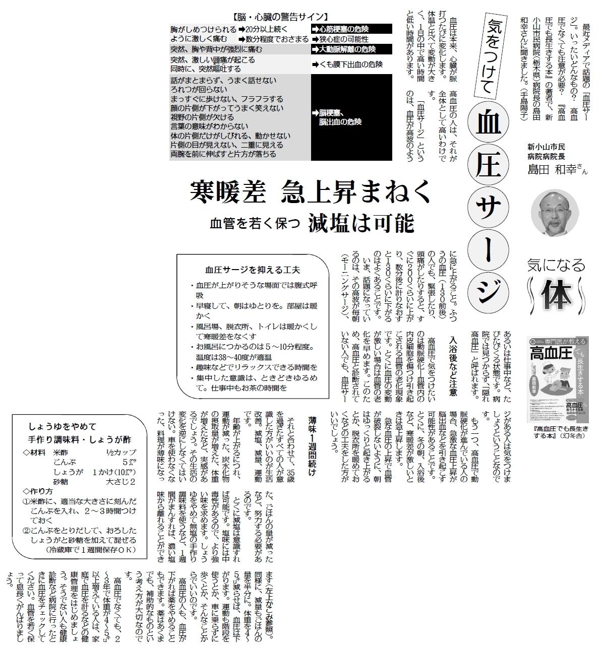 ★最近、メディアで話題の「血圧サージ」。いったいどんなもの? 高血圧でなくても注意が必要? 新小山市民病院院長の島田和幸さんに聞きました。(紙面を見る、1月12日付)
