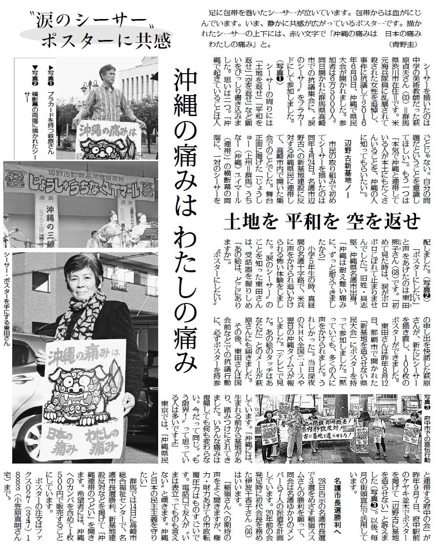 ★足に包帯を巻いたシーサーが泣いています。包帯からは血がにじんでいます。いま、静かに共感が広がっているポスターです。描かれたシーサーの上下には、赤い文字で「沖縄の痛みは 日本の痛み わたしの痛み」と。(紙面を見る、1月9日付)