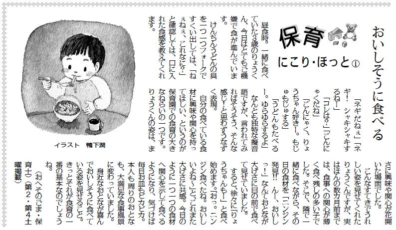 ★新連載「保育にこり・ほっと」(第2・第4土曜掲載)。保育士・おへそのごまさんが、保育園での豊かな育ちをつづります。1回目は「おいしそうに食べる」。(紙面を見る、1月13日付)