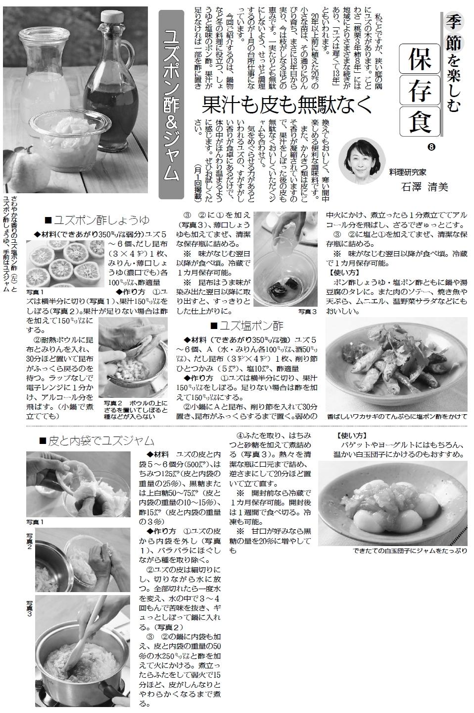 ★料理研究家・石澤清美さんの「季節を楽しむ保存食」(月1回掲載)。1月は「ユズポン酢&ジャム」です。(紙面を見る、1月10日付)