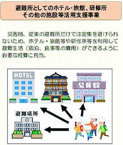 ▽災害救助法が適用された場合は、ホテルや旅館などの借り上げ、輸送、維持、管理にかかる費用は国庫負担▽同法が適用されない場合でも、今年4月1日以降に実施される費用については、「地方創生臨時交付金」の活用が可能―などです。