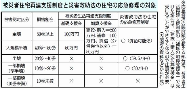 内閣府の「災害救助法に基づく住宅の応急修理に関するQ&A」(19年11月21日)では、「被災者生活再建支援金」と「応急修理」の併給が可能としています(別表の※)。また、床上浸水で悪臭が取れないなど、そのままでは生活できない場合、破損はなくても「応急修理」の対象となります。