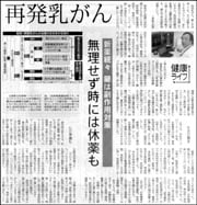 再発乳がん。厳しさはあっても、そう悲観することもないらしい。新たな薬剤が次々と登場しているから。有効な治療法を選び、治療を続け、元気に過ごすことも可能です。"鍵"は上手な副作用対策という。再発がん治療の目的が明らかにされています。症状緩和、症状発現の先送り、延命の三つ。浜松オンコロジーセンターの渡辺亨院長に聞きました。