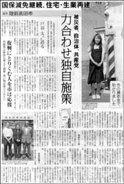 東日本大震災から11日で1年半。いま被災地で、国民健康保険税(料)減免など国の被災者支援削減が大問題に。そのなかで被災者を守る、自治体と日本共産党の取り組みが注目されています。岩手県陸前高田市からリポートします。陸前高田市長の戸羽太さんに聞きました。