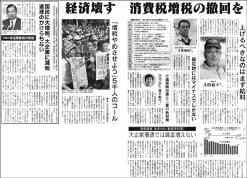 日本共産党の志位和夫委員長が1日の記者会見で発表した談話「国民に大増税、大企業に減税―道理のかけらもない―安倍首相の消費税増税表明に強く抗議し、撤回を求める」の全文を紹介します(全文はこちらからもごらんになれます)。宮城の水産加工会社「ヤマトミ」社長の千葉雅俊さんと「要介護者の暮らしを考える会」代表世話人の櫻井和代さんにも話を聞きました。