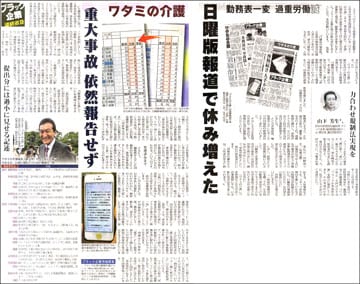 スタッフのサービス残業など過重勤務と入所者の事故が問題になっている「ワタミの介護」(本社・東京都大田区)。「赤旗」日曜版でその実態を取り上げた横浜市の介護施設で報道後、勤務条件が改善されました。ブラック企業告発で行政も対応するようになり、事態が動いています。
