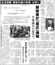 親族による扶養は生活保護を受ける「前提」―。生活保護制度をゆがめるこんな文書が申請者の親族に送られていることが、日本共産党の小池晃副委員長の国会質問で明らかになりました。小池氏の追及に、厚生労働省は非を認めて「是正」通知を出しました。