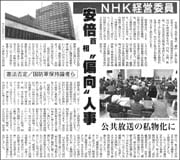安倍晋三首相主導の"側近"人事に批判が高まっています。安倍内閣提出の新しいNHK経営委員を8日、自民、公明、維新、みんなの各党の賛成で承認しました。来年1月に松本正之NHK会長の任期切れを控えており、NHKと政治との距離が、再び大きく問われています。