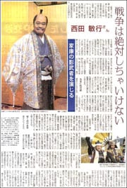 福島が故郷の俳優・西田敏行さん。今年は東日本大震災の被災地を舞台にした、映画「遺体〜明日への十日間」、NHK大河ドラマ「八重の桜」などに出演しました。原発事故の影響に苦しむ故郷の現状を憂えています。新春ワイド時代劇「影武者 徳川家康」(テレビ東京系)では、戦を拒み、誰もが自由に安心して暮らせる世をつくろうとする家康の影武者を主演しています。西田さんに娯楽時代劇の魅力や故郷への思いを聞きました。