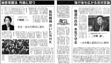 国会で自民・公明の与党が強行成立させた秘密保護法(与党とみんな・維新の共同修正)。法律として公布(13日)されても反対の世論はますます広がり、安倍内閣をあわてさせています。署名運動も始まりました。「法律の廃止をめざして取り組もう」―日曜版編集部はインタビューや寄稿で、各界からの発言を随時掲載していきます。今回は桜美林大学教授で元朝日新聞コラムニストの早野透さんと元NHKディレクターの戸崎賢二さんに話を聞きました。