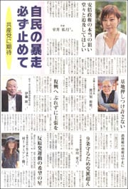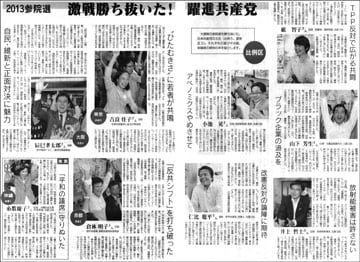 「3議席から8議席に大躍進した日本共産党に期待したい」―。参院選(21日投票)での自民圧勝と民主党大敗北を受けて、おごる安倍政権の暴走と正面対決し、抜本的な政治転換を訴える日本共産党の議席増に注目と期待が高まっています。参院選を考える大特集号です。作家・僧侶の瀬戸内寂聴さん、漫画家のやくみつるさんにも聞きました。