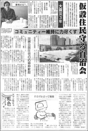 発生から3年がたった東日本大震災では、津波や原発事故で住まいを失った26万人を超す被災者が現在も厳しい避難生活を強いられています。岩手、宮城、福島の3県から被災者が集まる仙台市の仮設住宅の自治会長が語る3年目の現状とコミュニティーを守る取り組みとは―。