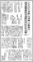 安倍内閣は4月からの消費税8%への大増税を強行しました。このため、たいへん心苦しいことではありますが、5月からは、「しんぶん赤旗」日刊紙、日曜版とも、3%の増税分の負担を読者のみなさんにお願いせざるをえないことになりました。