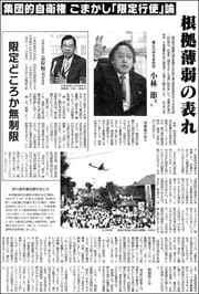 集団的自衛権行使を容認するために憲法解釈変更をねらう安倍内閣・自民党は、行使を「限定する」と主張し始めました。改憲派の憲法学者、小林節慶応大学名誉教授・弁護士に聞きました。日本共産党の志位和夫委員長は記者会見(10日)で、自民党の高村正彦副総裁による「わが国の存立を全うするために必要最小限のものに限定して行使する」という集団的自衛権の「限定行使」論について二つの問題点を指摘しました。