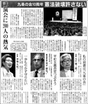 「九条の会」が発足して、10日で10年になりました。憲法9条改悪反対の一点で力をあわせようと9人の文化人の呼びかけから始まった同会。現在では全国各地、各分野で7500を超える会が結成されています。都内でこの日開かれた講演会は、集団的自衛権行使による「戦争する国」づくりに反対する熱気にあふれました。九条の会呼びかけ人の作家・大江健三郎、憲法研究者の奥平康弘さん、作家の澤地久枝さんの講演の要旨を紹介します。