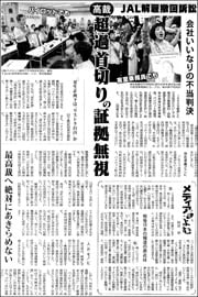 165人を解雇した日本航空にたいして労働者が解雇撤回・原職復帰を求めた訴訟で、東京高裁は客室乗務員、パイロット両裁判とも解雇を認めた東京地裁判決を支持し、原告側の控訴を棄却しました。働くものの権利と空の安全を後退させる不当判決。原告は上告の方針を決めています。日本共産党の山下芳生書記局長は日航の客室乗務員、パイロットの訴えを棄却した東京高裁のは不当判決に対して、強く抗議する談話を発表しました。