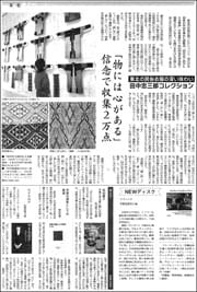 東北の民族衣服コレクションと、それに触発された現代の美術家の作品を集めた展覧会「田中忠三郎が伝える精神」が青森県の十和田市現代美術館で開催されています。手間ひまかけた衣服に込められた庶民の思いとは...。