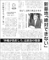 就任から約4カ月後やっと実現した沖縄県の翁長雄志知事と菅義偉内閣官房長官との会談(5日、那覇市内)。翁長知事は冒頭、名護市辺野古への米軍新基地建設を強行しようとする安倍内閣に、沖縄の怒りを直言しました。県内外に大反響を呼んだ知事発言の要旨を紹介します。元自民党沖縄県連会長、本県議会議長の外間盛善さんにも話を聞きました。