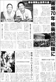 「被爆70年を核兵器廃絶の転機に」と開かれた原水爆禁止2015年世界大会(2〜9日、広島・長崎両市)をリポートします。平和行進青年リレーに参加した日米の若者にも話を聞きました。
