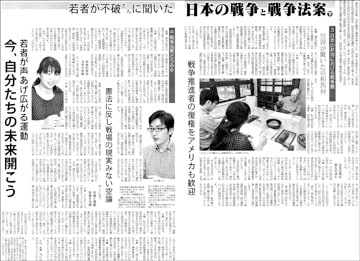 広島県庄原市では自民党県議の呼びかけで市議20人中19人が参加する「ストップ・ザ安保法制 庄原市民の会」が発足(7月31日)。首都圏では大学生が続き、高校生ら5千人がデモ(3日)-。戦争法案に反対する動きが急拡大中です。絵本『せんそうしない』を出版した、詩人の谷川俊太郎さんにも話を聞きました。