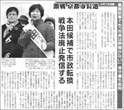 24日告示の京都市長選(2月7日投票)。「憲法市政みらいネット」の本田久美子さん(65)=京都教育センター事務局長、日本共産党推薦=が、現職の門川大作氏(65)=自民、公明、民主推薦=を激しく追い上げています。