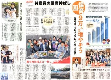 待機児童問題で今年も保護者が怒りの声をあげています。安心して預けられる認可保育園を増やし、待機児ゼロにしてほしいという願いは切実です。東京都議選(23日告示7月2日投票)でその願いを託せるのは日本共産党です。