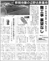 辺野古の米軍新基地建設で、軟弱地盤が広がっているため地盤改良工事の承認申請を沖縄県にする必要があると首相が認めました。(4面)